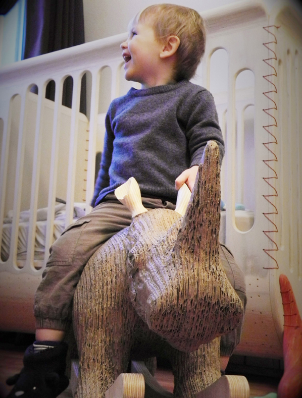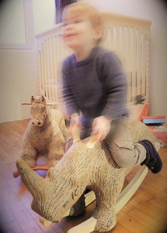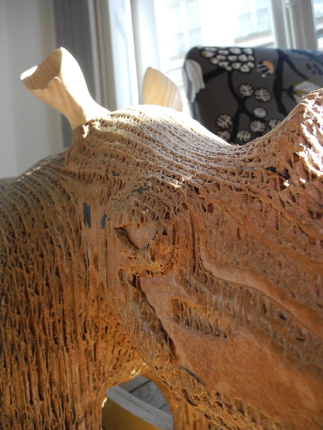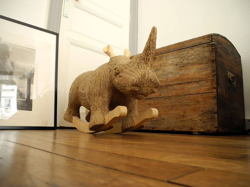 Chaque tranche nous sert de gabarit pour découper le carton que nous collectons auprès de vendeurs de vélos de la région nantaise. Une fois les tranches assemblées avec de la colle vinylique (non toxique), Carlos ressemble à ses petits frères les Carlitos avec un aspect en « escaliers ». Vient ensuite une phase de lissage et de ponçage pour gommer les différences de niveaux entre chaque couche. On enchâsse ensuite les oreilles et les bascules en peuplier qui ont subit le même traitement et on lasure l’ensemble avec des huiles naturelles. Vous savez tout !