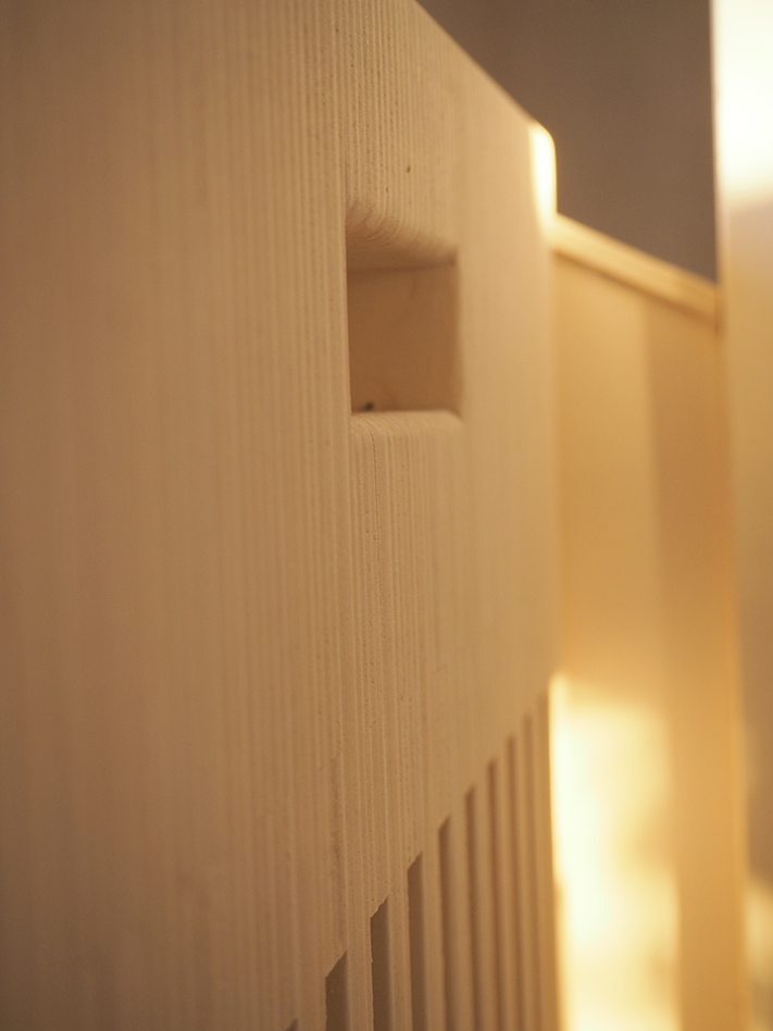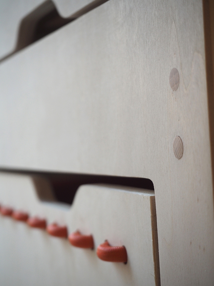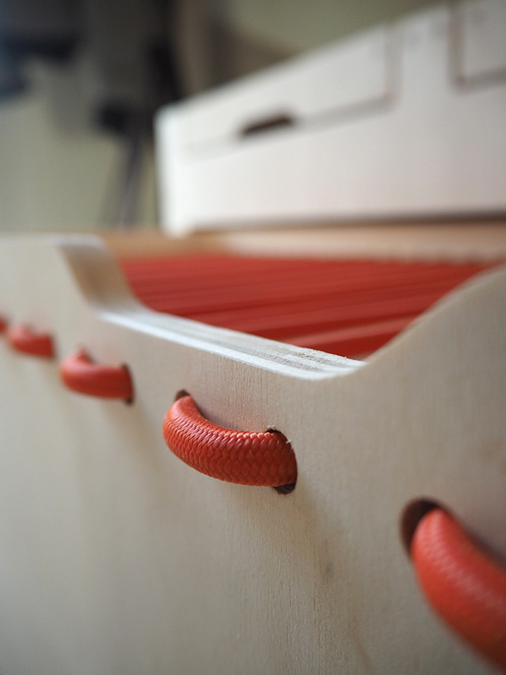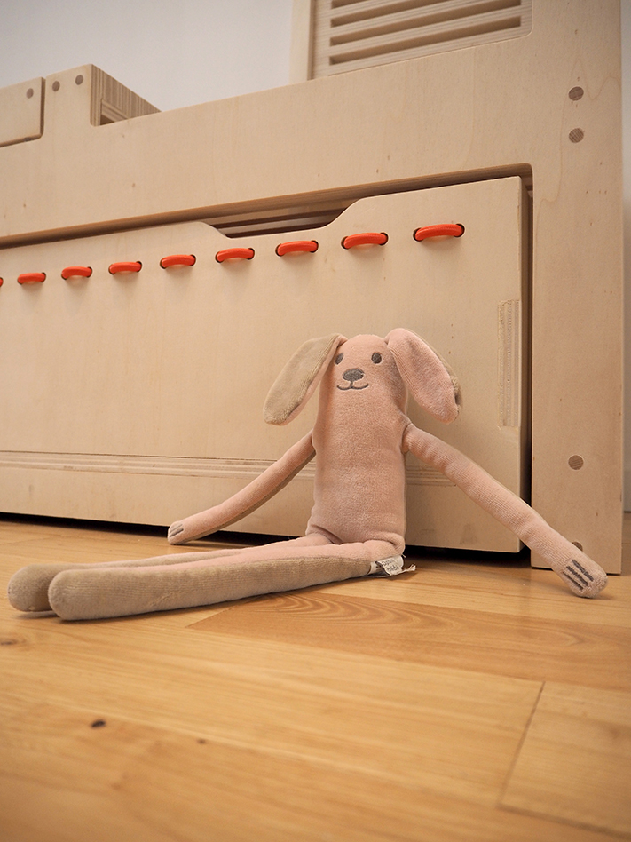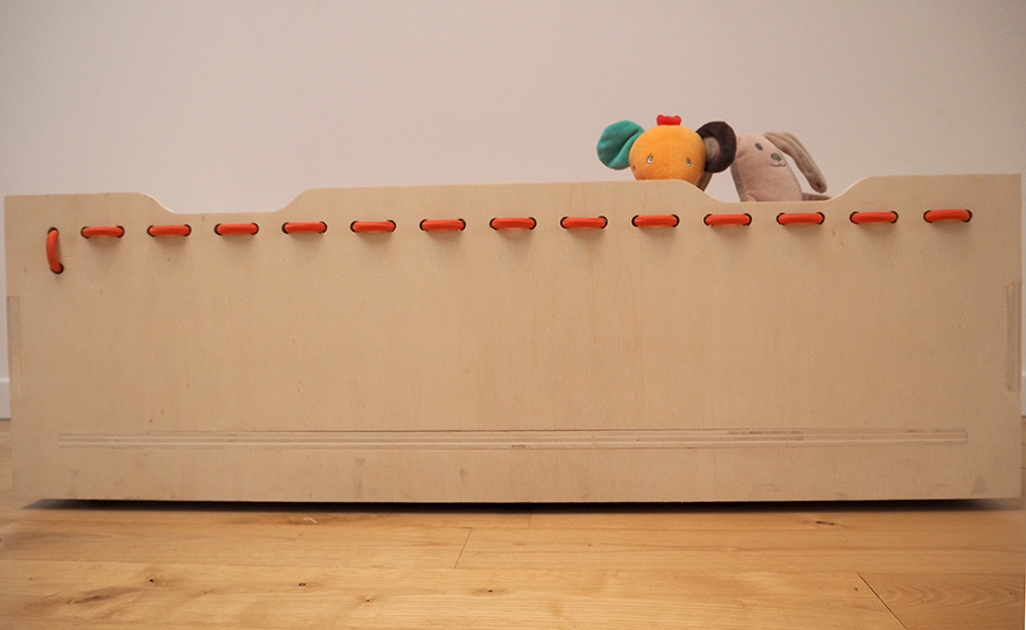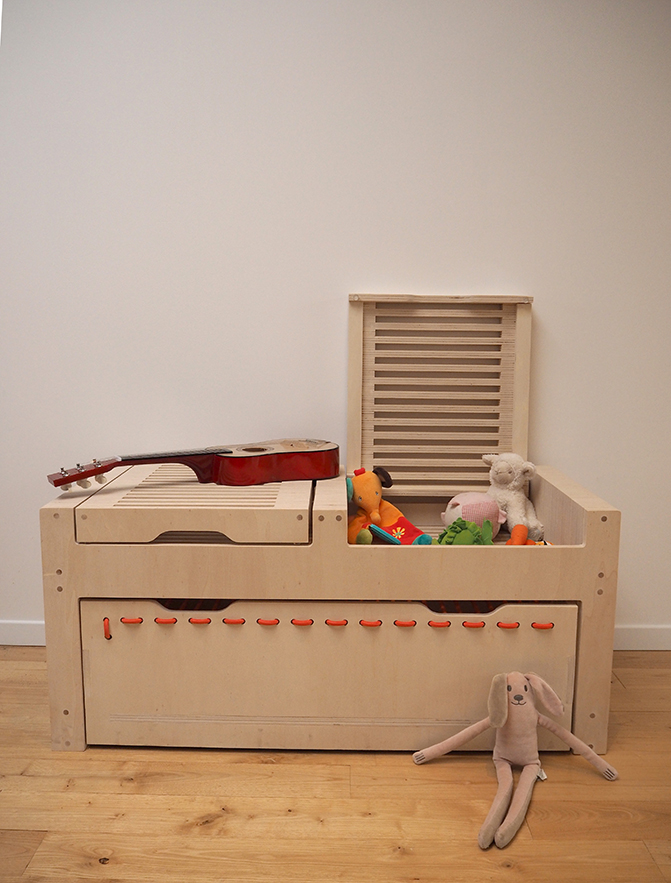Il est réalisé en contreplaqué de peuplier du Grand Ouest, les tourillons sont en hêtre. Le Coffre est monté sur roulette pour un confort d’usage et l’élastique Sandow conviendra à tous les âges. Nous l’avons pensé minimaliste et ergonomique avec des angles adoucis. Sa structure ajourée le rend relativement léger et facile à transporter pour son volume.