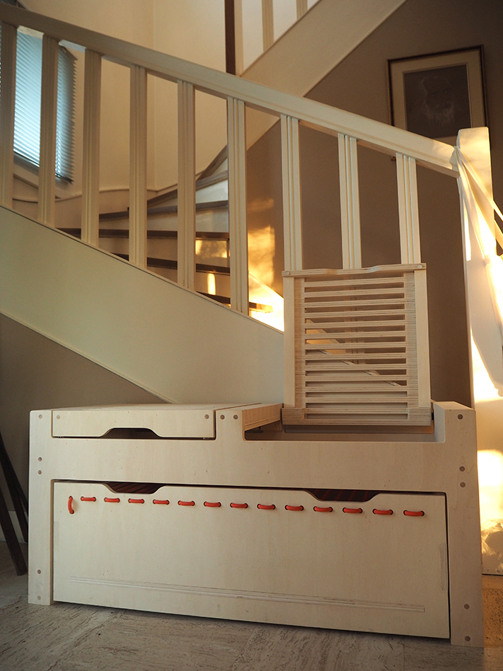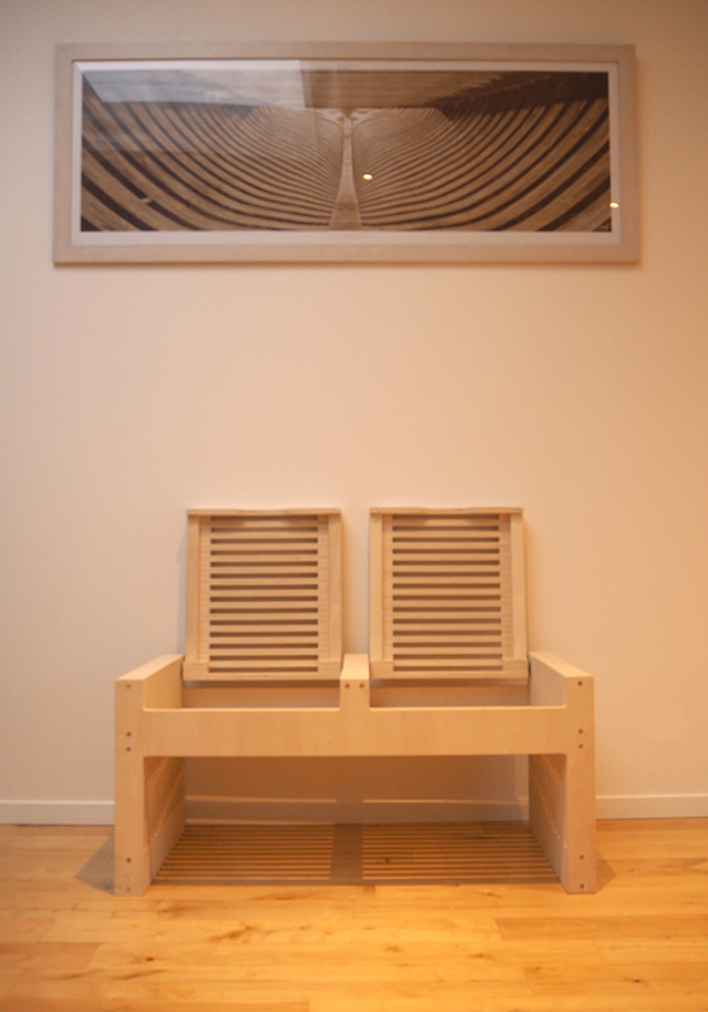 Il possède deux volumes de rangement, le premier situé sous l’assise et accessible par deux ouvrants et le second dans un coffre amovible et habillé d’un élastique qui vient rythmer la façade.