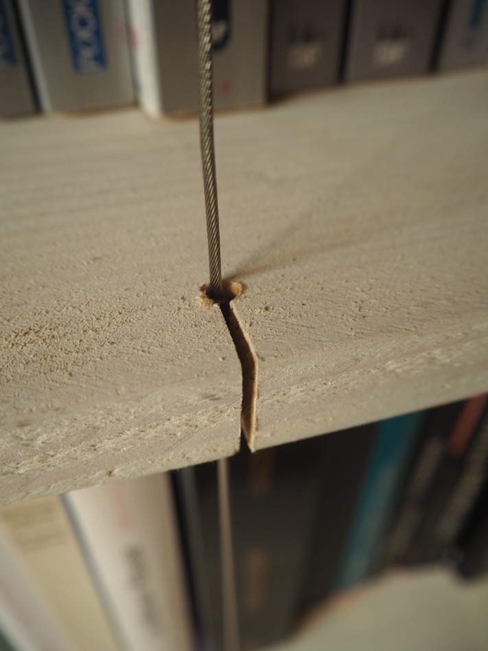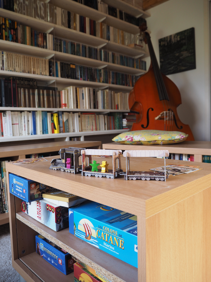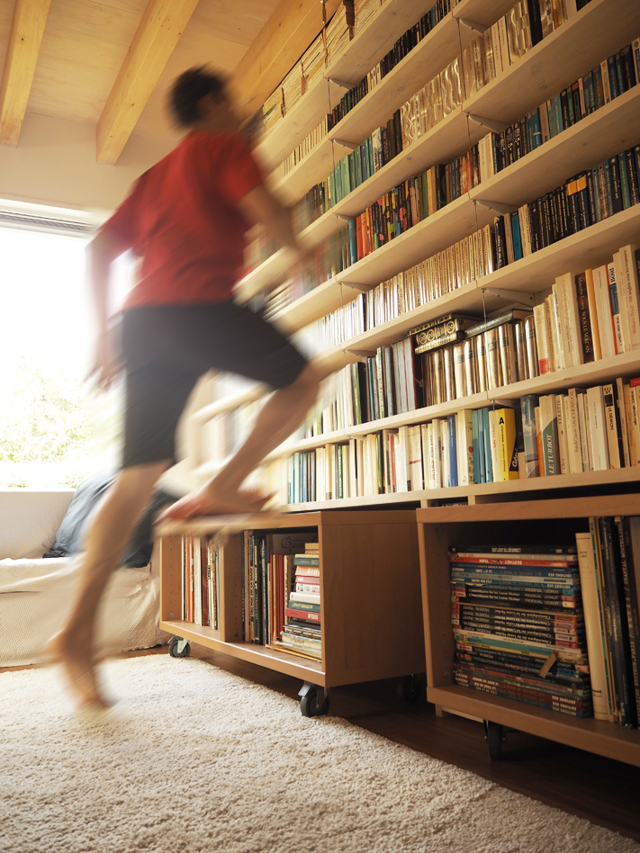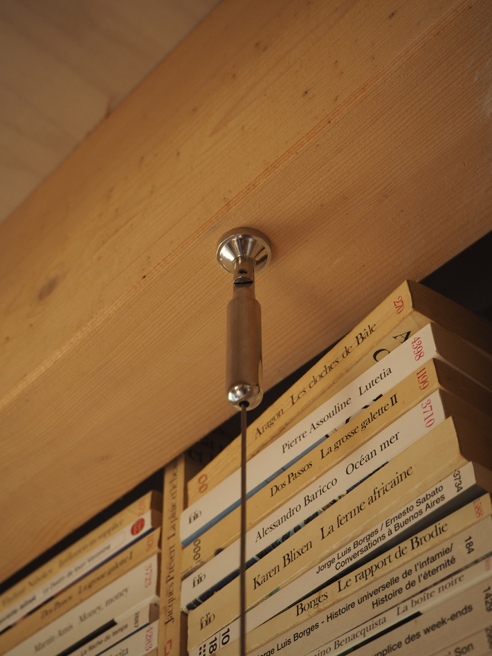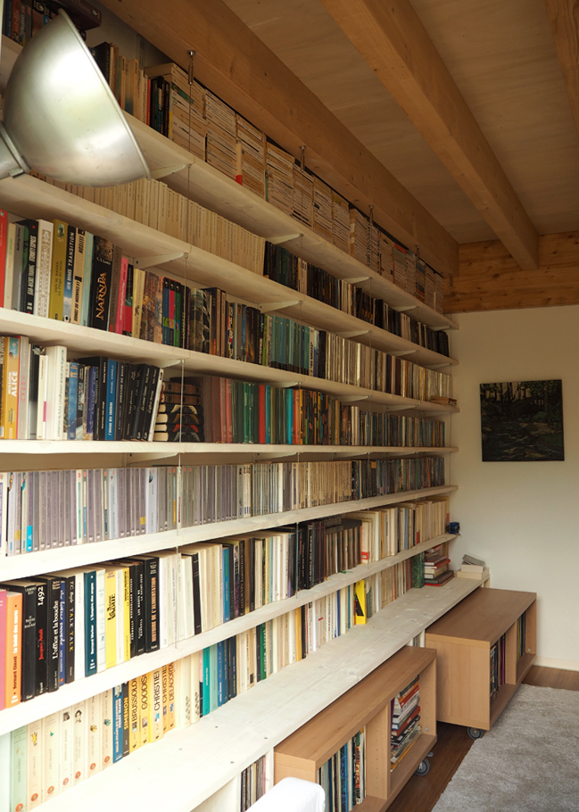 Le projet s’inscrit dans l’existant en venant se suspendre sur le solivage du plancher de l’étage par un système de câbles d’acier. Nous devions également y intégrer trois modules qui servaient précédemment de table de salon. Nous avons opté pour des caissons sur roulettes qui permettent de stocker des bandes dessinées, d’accéder aux ouvrages les plus hauts et de transformer la salle en espace de jeux avec bancs et table basse.