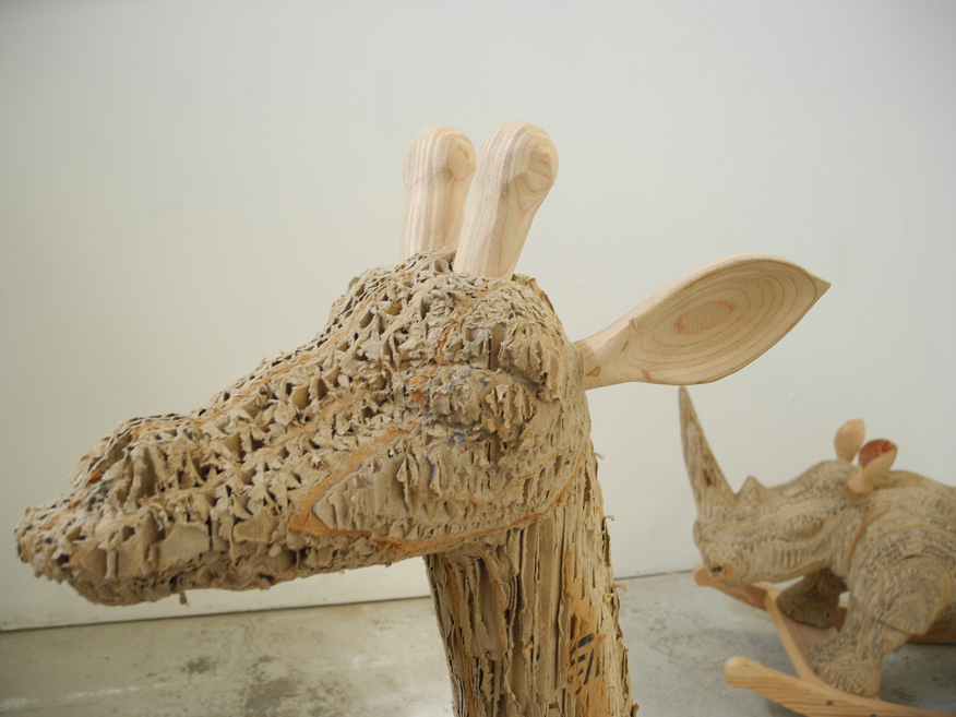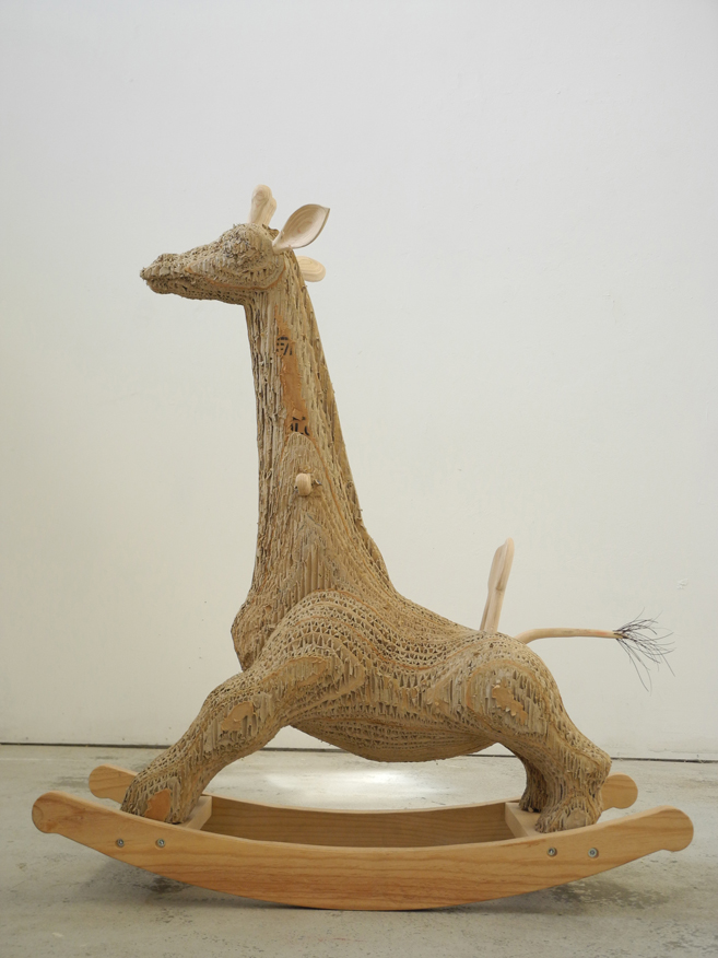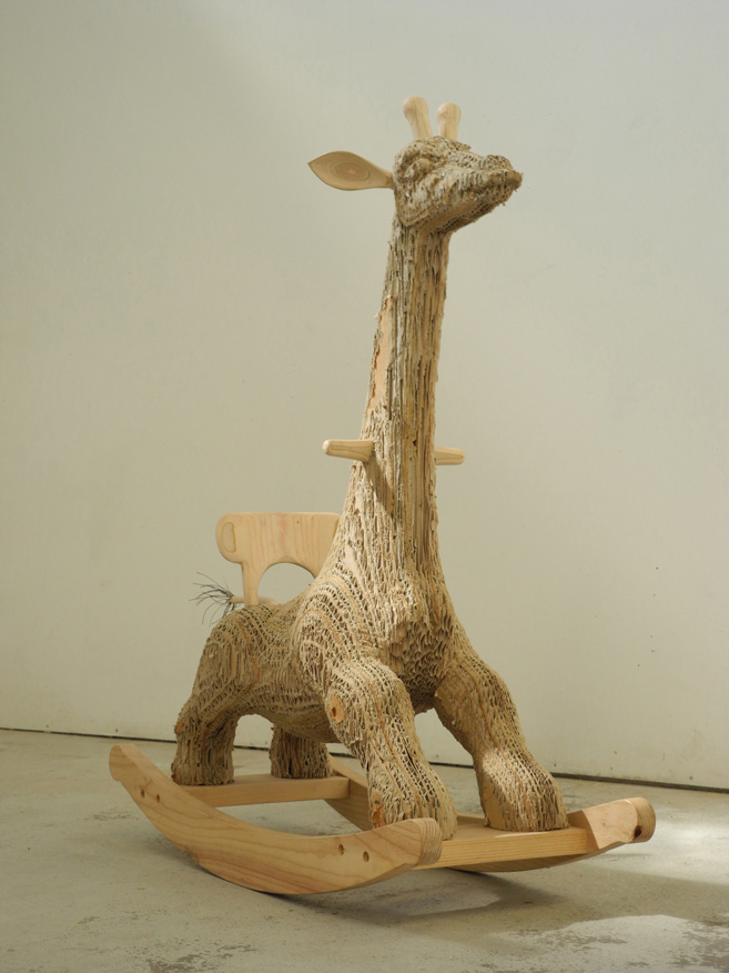 Olaf est toujours en phase de prototypage et sera bientôt prête à être déclinée en petite série. Comme Carlos, elle est réalisée en tranche de cartons de vélos collectées, découpées puis sculptées à l’atelier. Ses oreilles, ses poignées, le dossier et ses bascules sont réalisée en pin brut.