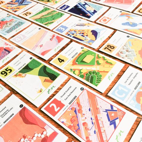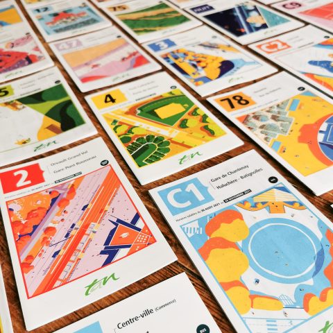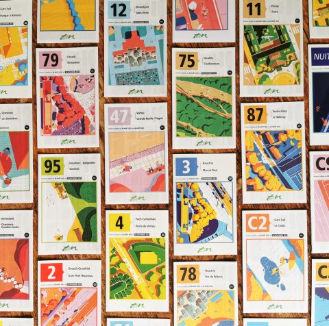 En juxtaposant sur certaines illustrations des bâtiments éloignés géographiquement les uns des autres, nous avons voulu évoquer le fait que le réseau de transport en commun permet de ralier aisément n’importe quel point du territoire par un maillage dense.
