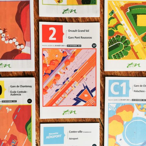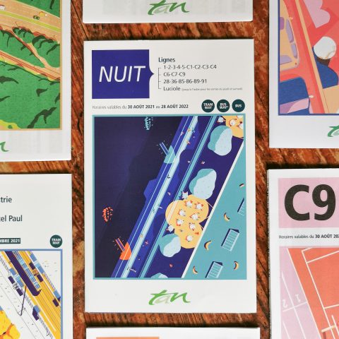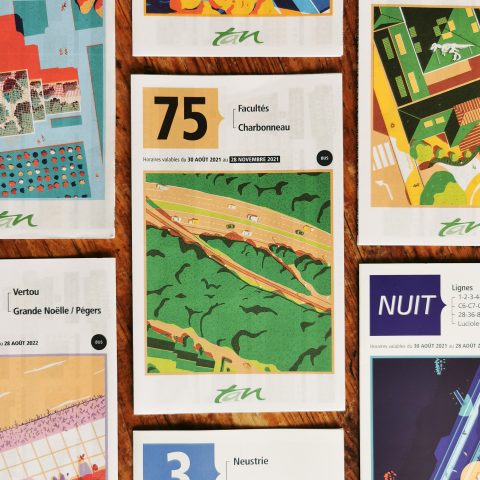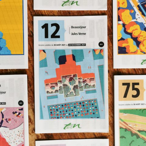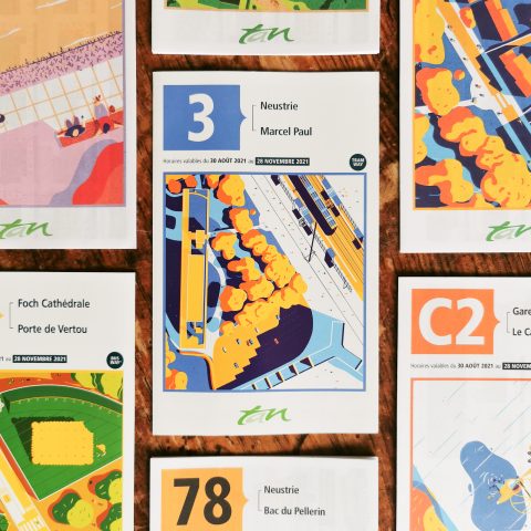 L’agence de communication The Links m’a confié la réalisation des illustrations des horaires pour l’ensemble des lignes de bus, tramways et bateau-bus de la TAN sur la saison 2021-2022.