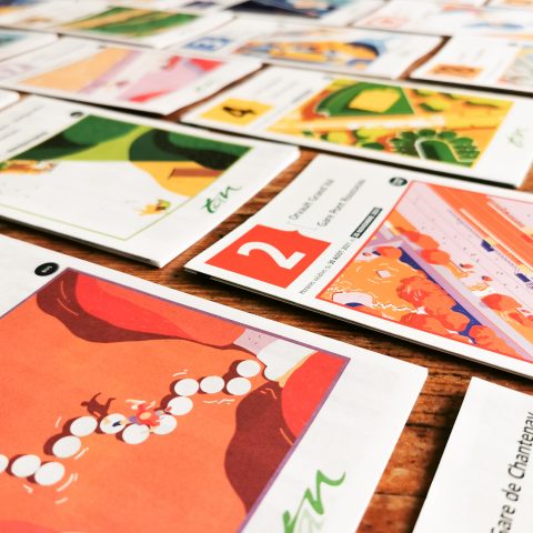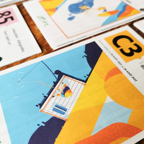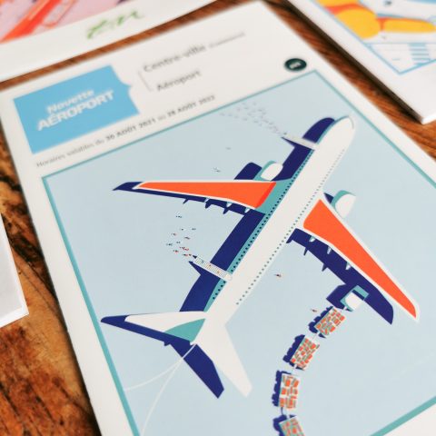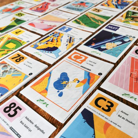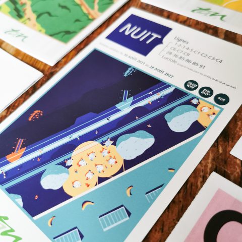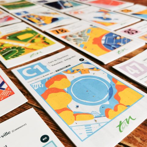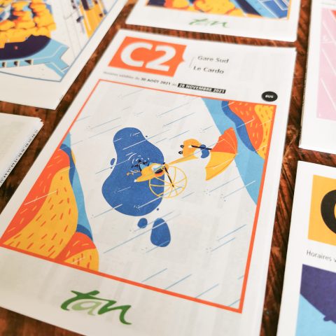 Le projet comporte 61 illustrations distinctes, déclinées sur 5 palettes de couleurs différentes. Vous trouverez ci-contre une sélection de quelques unes des illustrations. Vous pouvez retrouver ces visuels sur les flyers à l’agence de mobilité de la TAN.